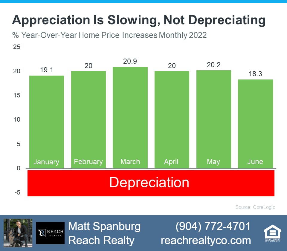 This means price growth is still climbing compared to last year but at a slower rate. As the Monthly Mortgage Monitor from Black Knight explains: “Annual home price growth dropped by nearly two percentage points . . . – the greatest single-month slowdown on record since at least the early 1970s. . . While June’s slowdown was record-breaking, home price growth would need to decelerate at this pace for six more months to drive annual appreciation back to 5%, a rate more in line with long-run averages.” Basically, this means, while moderating, home prices are still far above the norm, and we’d have to see a lot more deceleration to even fall in line with more typical rates of home price growth. That’s still not home price depreciation.